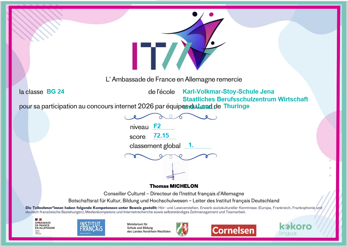 Nunmehr liegen die Wettbewerbsergebnisse vor. Die Klasse BG 24 erreichte 72,15 von 80 Punkten und belegte damit thüringenweit unter 59 teilnehmenden Schulen Platz 1! Bereits im vergangenen Schuljahr nahm die Klasse BG 24 am Internetteamwettbewerb teil und belegte thüringenweit den 1. Platz in der Niveaustufe F1. Alle diesjährigen Ergebnisse sind auf der Plattform https://www.internetteamwettbewerb.de veröffentlicht.