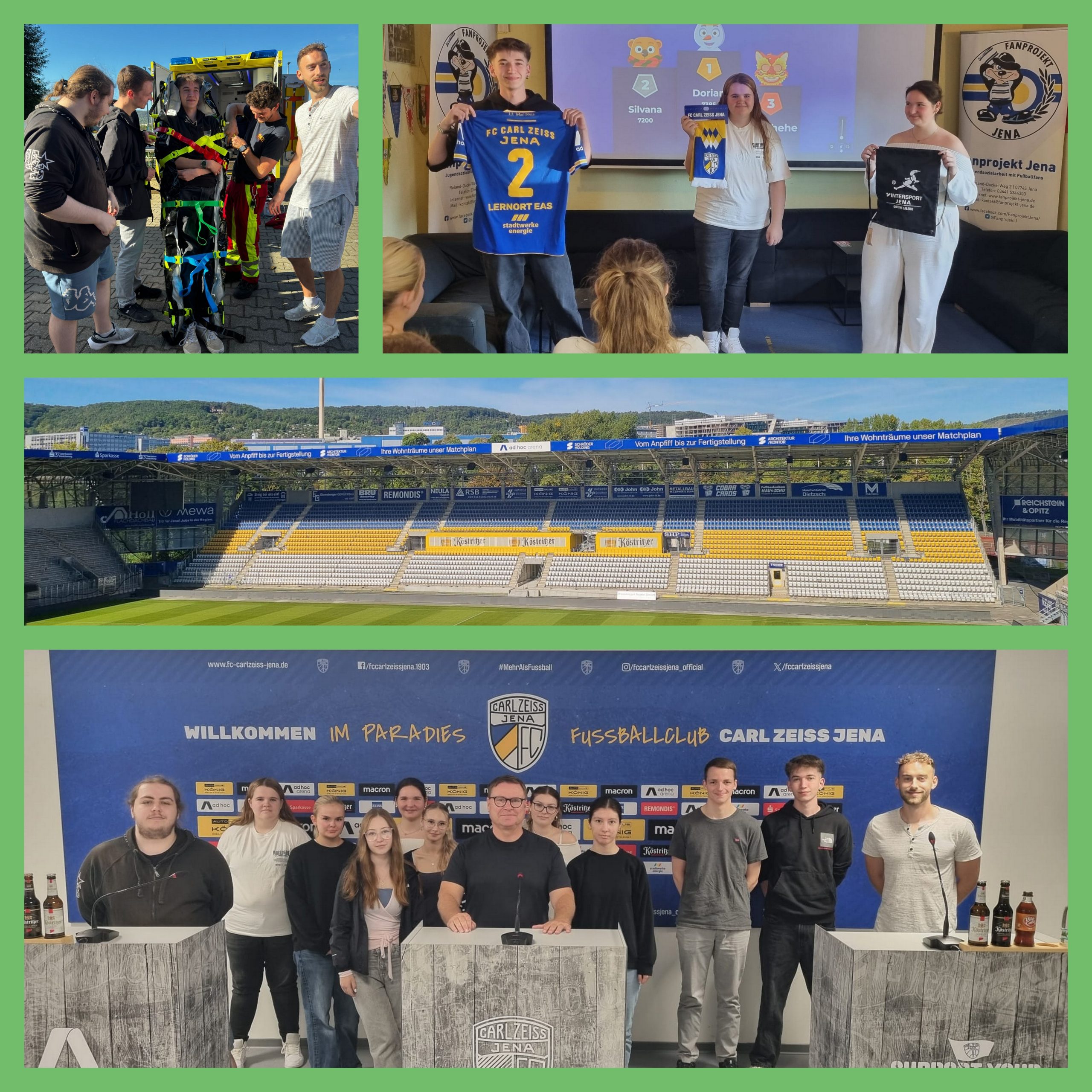 Im Rahmen der Berufsorientierung besuchte die BFS 24 am 19.9.25 die „ad hoc arena“ im Ernst-Abbe-Sportfeld. Wer hätte gedacht, dass es im Stadion nicht nur um den Beruf des Fußballers geht? Tiefe Einblicke gab es in die Berufe des Greenkeepers, den Verkauf im Fanshop und es wurde hinter die Kulissen der Marketingabteilung geschaut. Direkt zum Anfassen wurde der Beruf des Notfallsanitäters erklärt.