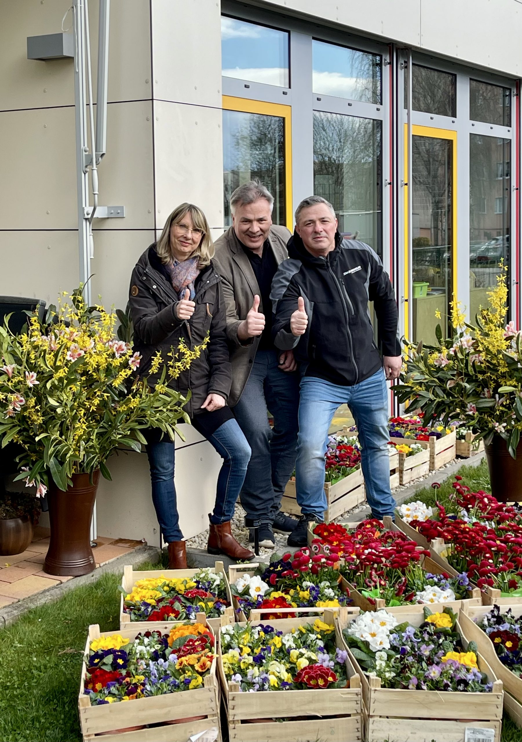 Traditionell spendete der Arbeitskreis SCHULEWIRTSCHAFT Jena/SHK die Blumendekoration des Berufs-Info-Marktes an das Haus EKKStein. Hocherfreut nahm Frau Katja Heinze die üppigen Frühlingsgrüße von unserem Kollegen Dr. Rose und unserem Hausmeister entgegen. So können sich demnächst die Familien krebskranker Kinder, die derzeit im Universitätsklinikum behandelt werden, an den hübschen Frühblühern erfreuen.