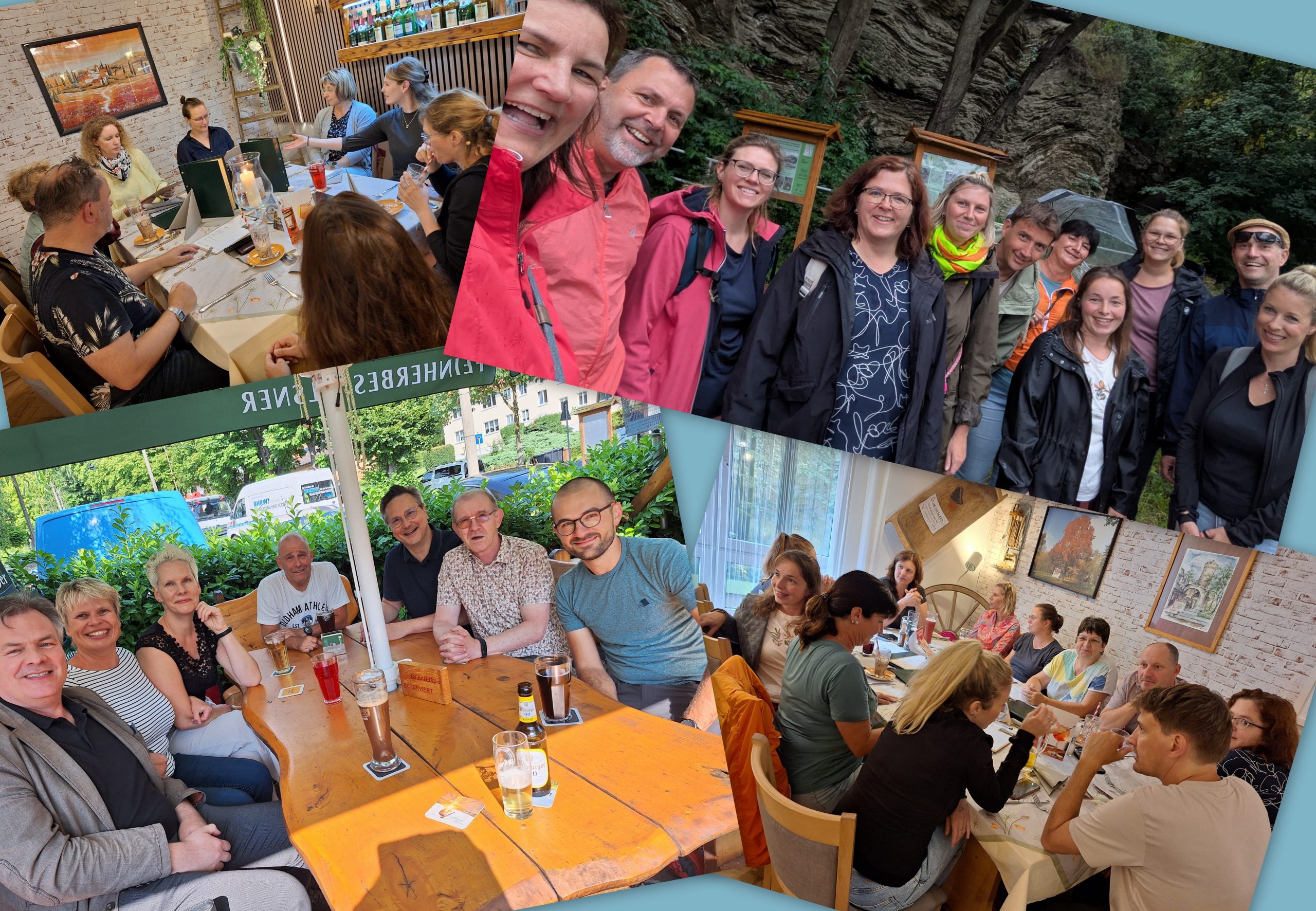Elf unerschrockene Kolleginnen und Kollegen wanderten am Dienstagnachmittag in der Vorbereitungswoche trotz Dauerregen vom Stadtzentrum über das Pennickental und die Sommerlinde zum „Gasthaus am Goethepark“ in Drackendorf. Dort trafen sie – völlig durchnässt, aber glücklich – auf weitere Lehrkräfte, die allerdings unabhängig von einem geplanten Spaziergang durch die Oberaue bzw. einer kleinen Radtour angereist waren. Am Abend zeigte sich doch die Sonne und das Kollegium konnte im Biergarten fröhlich und entspannt miteinander plaudern.